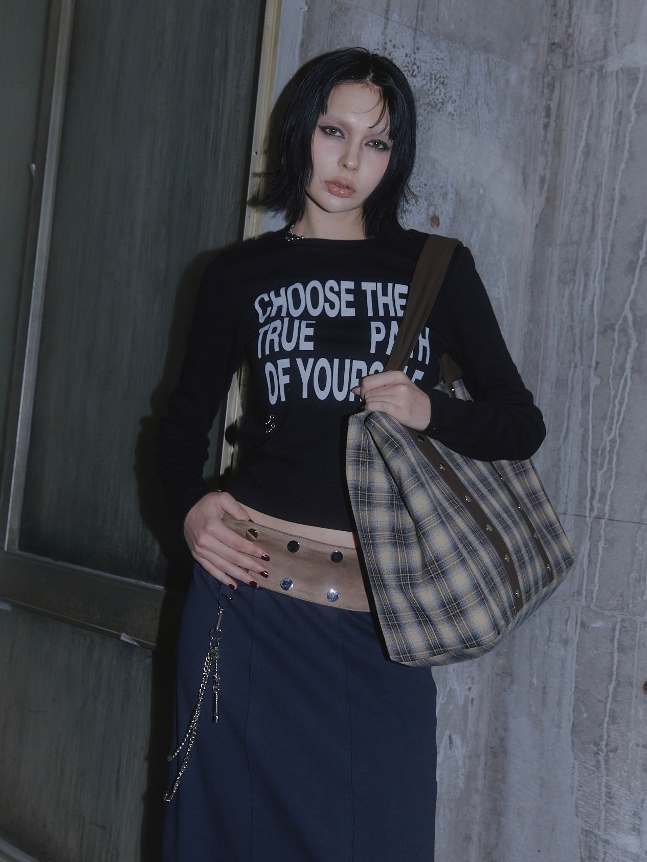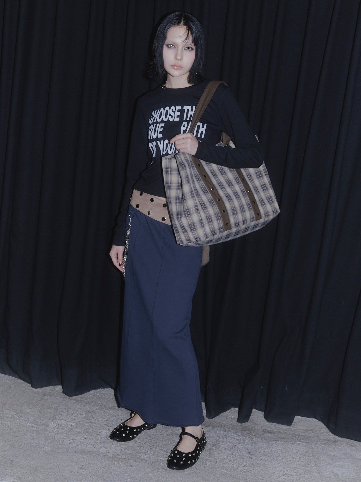 使いやすく、ポイントになるチェック柄のビッグバッグ。持ち手のベルトはスエード素材になっていて、大きめのスタッズがアクセントに◎パソコンも入る大容量サイズになっていて、中は水筒やペットボトルを立てて入れられる内ポケット付き。利便性にもこだわった、通勤や通学におすすめのアイテム。BLACK/BROWNの2色展開です。